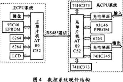 根据冲床数控系统实现的功能,完成数控系统的硬件设计。硬件设计主要包括微处理器( CPU)以及外围扩展接口的设计。系统CPU采用双MCU结构,设计成主从式分布结构,即分为主CPU和从CPUtI,二者之间通过RS485串口通讯。主CPU系统主要负责完成用户加工程序的输入处理、文字图形显示、自诊断、系统监控等管理工作。从CPU系统负责完成数据运算、插补计算以及位置控制、速度控制等实时作业。